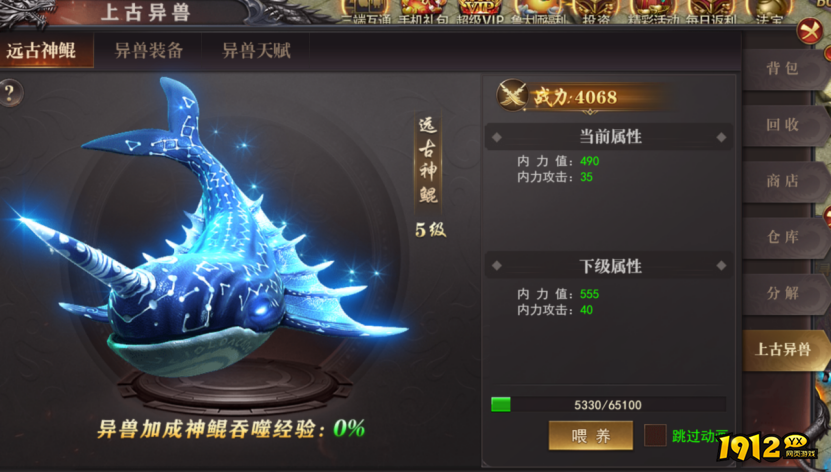 (1).喂养道具可以获取神鲲经验,概率获取异兽装备和碎片