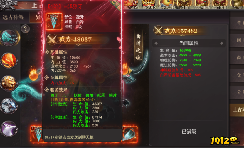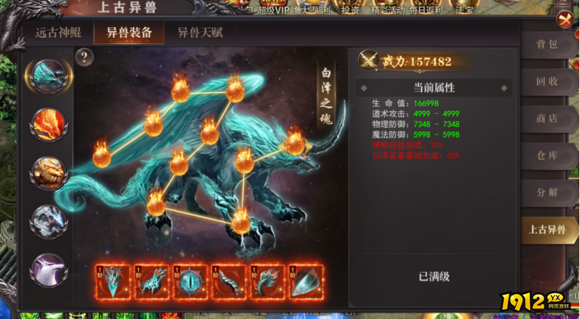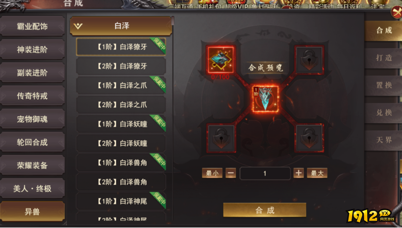 (3).装备合成:通过神鲲喂养获取异兽碎片,碎片可以合成异兽装备